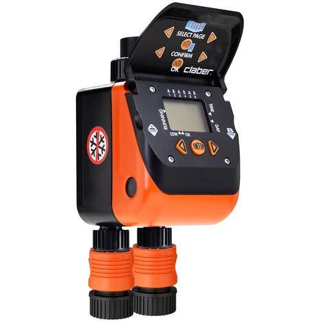 Der erste Zwei-Wege-Programmierer, der auf den Markt gebracht wurde, sehr erfolgreich in der Forschung und in der Claber-Qualität. Die Programmierung erfolgt mit nur drei Schaltflächen über ein System interaktiver Seiten, die über den großen Bildschirm scrollen. Dank des doppelten bistabilen Magnetventils garantiert Aquadue Duplo eine personalisierte und 100% zuverlässige Bewässerung. Keine elektrischen Anschlüsse erforderlich: Es funktioniert mit einer 9-V-Batterie, die für die gesamte Saison ausreicht. Der große LCD-Bildschirm erleichtert das Programmieren in ein oder zwei Zeilen mit Bewässerungszeiten von 1 Minute bis 23 Stunden und 59 Minuten. Es ist möglich, dreimal täglich zu gießen. Es wird auch eine Verbindung mit dem Regensensor hergestellt, der das ausgewählte Programm bei Regen unterbricht und es automatisch wieder aufnimmt, wenn das gute Wetter zurückkehrt.