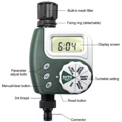 Der einzige Ablaufschlauch Wasserhahn Timer macht Bewässerung werden einfach, nur den Timer einstellen Sie hilft sparen Wasser. Es gibt manuelle und automatische Option Funktionen, Digitalanzeige und wasserdicht Shell, einfach zu bedienen.