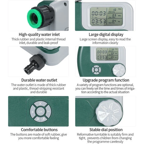 Funktionen: [Zeitgesteuerte Bewässerung] Die Bewässerungsdauer kann zwischen 1 Minute und 300 Minuten eingestellt werden. Die Bewässerungsfrequenz kann alle 6 oder 12 Stunden bis alle 7 Tage eingestellt werden.[2 Ausgänge] Jeder Port kann unabhängig eingestellt werden. Mit dem manuellen Bypass können Sie den Wasserhahn sofort verwenden, ohne das eingestellte Programm zu unterbrechen.[Digitalanzeige] Großer digitaler Bildschirm und lesbare Ziffern sorgen für gute Sichtbarkeit bei schlechten Lichtverhältnissen oder sogar bei Dunkelheit.[Wetterfest] Mit der wasserdichten Hülle können Sie sie im Freien verwenden, ohne sich um Regentage sorgen zu müssen.[Benutzerfreundlich] Einfach zu bedienen und einzustellen ohne komplizierte Installation und Bedienung. Drehen Sie einfach den Knopf und drücken Sie den Knopf, das ist es!