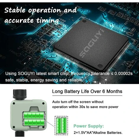 ��Fortschrittliche PCB-Technologie�� Der Bew?sserungstimer verf��gt ��ber einen eingebauten hochpr?zisen IC-Chip und ein vollst?ndig geschlossenes Niederdruck-Magnetventil, das komplexe Bew?sserungspl?ne schnell verarbeiten kann, mit einer stabileren Ein-Aus-Ventilsteuerung. Es wird mit 2 x 1,5 V AA-Batterien (nicht im Lieferumfang enthalten) betrieben und kann l?nger als 6 Monate arbeiten.