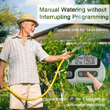��Automatische und manuelle Bew?sserung��: Es verf��gt ��ber 2 Bew?sserungsmodi, automatisch/manuell. Im automatischen Modus kann die Bew?sserungsdauer 1 s bis 99 Minuten und die Bew?sserungsh?ufigkeit 1 Std. bis 23 Std. oder 1 Tag bis 15 Tage betragen. Im manuellen Modus k?nnen Sie von 1 s bis 99 min bew?ssern, damit k?nnen Sie vor��bergehend bew?ssern, ohne den voreingestellten Bew?sserungsplan zu unterbrechen.