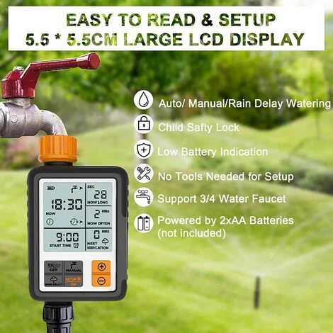 ��Einfach zu installieren und abzulesen��Mit dem gro?en LCD-Display k?nnen Sie die n?chste Bew?sserungszeit, die aktuelle Uhrzeit und den Batteriestatus leicht erkennen. Dr��cken Sie die Taste, um die aktuelle Zeit, Startzeit, Dauer und H?ufigkeit einzustellen. Dann arbeitet Ihr Gartenbew?sserungssystem automatisch gem?? dem Zeitplan.