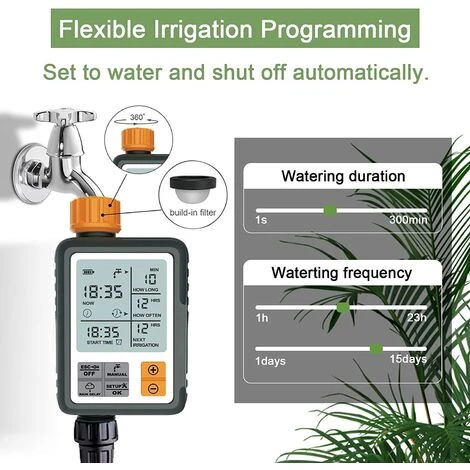 ��Automatische und manuelle Bew?sserung��: Es hat 2 Modi, automatisch/manuell. Im automatischen Modus kann die Bew?sserungsdauer von 1 Sekunde bis 300 Minuten und die Bew?sserungsh?ufigkeit von 1 Stunde bis 23 Stunden oder von 1 Tag bis 15 Tage betragen. Im manuellen Modus k?nnen Sie von 1 bis 240 Minuten bew?ssern, es erm?glicht Ihnen, vor��bergehend zu bew?ssern, ohne den voreingestellten Bew?sserungsplan zu unterbrechen.