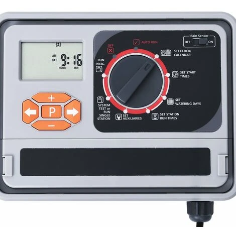Die Bewässerungssteuerung kann 4, 6, 9 oder 11 Ventile steuern. Die Bewässerungsuhr verfügt über 6 Bewässerungsprogramme und jedes Programm hat seine Startzeit, Endzeit und Laufzeit. Der Bewässerungsplan kann für jeden Tag der Woche mit einer bestimmten Anfangs- und Endzeit eingestellt werden. Die Laufzeit kann je nach Einstellung von 1 Minute bis 12 Stunden 59 Minuten betragen. Der Garten-Bewässerungsautomat wird mit Wechselstrom betrieben und lässt sich einfach mit einem Dreh- und Druckknopf zur Datenauswahl und -bestätigung bedienen. Der Anschluss eines Regensensors oder eines Feuchtigkeitssensors (nicht im Lieferumfang enthalten) ist möglich, um die Bewässerung an regnerischen Tagen oder bei zu nassem Boden zu überspringen und die Wassereinsparung zu maximieren. Eine 9-V-Alkalibatterie (nicht enthalten) wird außerdem benötigt, um die Anzeige der Digitaluhr auf dem Bildschirm und den Speicher des vorherigen Parameters aufrechtzuerhalten.