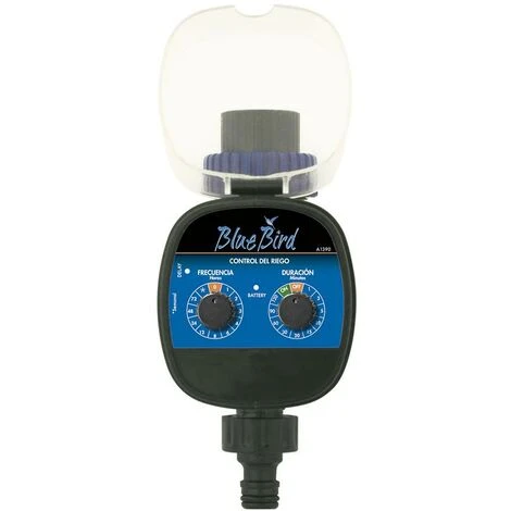 Blue Bird Bewässerungsprogrammierer. Anschluss: rh 3/4 „. Betriebsdruck von 0 bis 6 bar. LED: Batterieladeanzeige. 2 Wählscheiben zur Anzeige des Intervalls und der Dauer der Bewässerung. verschiedene Optionen der Bewässerungsfrequenz: von 1 bis 72 Stunden oder Einmal pro Woche Bewässerungsdauer von 1 bis 120 Minuten werden 2 x 1,5 Volt aaa-Batterien (nicht im Lieferumfang enthalten) verwendet, wenn die Batterie schwach ist. Das Ventil schließt automatisch vorne und das Batteriefach ist durch eine externe transparente Abdeckung geschützt Verzögerungsfunktion: Ermöglicht die Verzögerung des Bewässerungsbeginns von 1 auf 12 Stunden. Mit Kunststoffgitterfilter und rh 3/4 „-Hahnadapter. 2 Jahre Garantie