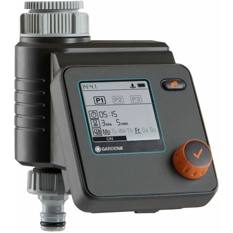 Mit der Gardena Bewässerungssteuerung Select lässt sich die Bewässerung flexibel und individuell planen. Für die Bewässerung lassen sich drei unterschiedliche und voneinander unabhängige Zeitpläne erstellen. Einstellbar sind Start, Dauer und Wochentage der Bewässerung. Die Steuerung ist batteriebetrieben, wird direkt an den Wasserhahn angeschlossen und lässt sich leicht durch nur einen Dreh- und Drückschalter zur Auswahl der Daten und zur Bestätigung bedienen. Ein gut lesbares LC-Display zeigt alle Einstellungen auf einen Blick an. “Water Now“ Funktion: Soll die Bewässerung einmal sofort gestartet werden, lässt sich diese manuell aktivieren, ohne das Gerät vom Wasserhahn zu entfernen oder Einstellungen zu verändern. Die Bewässerungssteuerung funktioniert durch die “Safe Stop“ Technologie immer zuverlässig: Ist der Energiestand der Batterie zu gering, um einen Bewässerungsvorgang komplett zu steuern, wird er gar nicht erst gestartet. Die Batterieanzeige im Display weist rechtzeitig