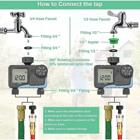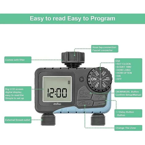 Flexible Bewässerungsprogrammierung: Dieser Bewässerungstimer ermöglicht eine größere Bandbreite an Laufzeiten und Intervallen. Die Bewässerungsdauer reicht von 1 Min. bis 3 Std. 59 Min. und das Bewässerungsintervall von 1 Std. bis 12 Std. oder von 1 Tag bis 7 Tage. Das kann Ihren Bewässerungsplan vollständig anpassbar machen. Zwei Zonen: Klicken Sie auf die Schaltfläche „ZONE“, um die Zone zu ändern. Programmierbar und einfach zu bedienen: Ausgestattet mit einem LCD-Bildschirm zeigt dieser Wasserhahn-Timer für Sprinkler die aktuelle Uhrzeit, Programmdetails, den Batteriestand und fast alle Informationen über den Betrieb an. Verfügt über eine Drehkupplung für einen einfachen und schnellen Anschluss. Das Benutzerhandbuch ist in der Box enthalten, damit Sie es lesen können. Anwendbare Szene und Wassereinsparung: Es ist ideal für Bewässerungsanwendungen in Gärten, Höfen, Gewächshäusern, Blumenbeeten usw. Messen Sie den Wasserverbrauch, um eine Überbewässerung zu verhindern. Regenverzögerungsfunktion zur Wassereinsparung. Die Standardverzögerungszeit beträgt 24 Stunden und kann nicht geändert werden. Batterieleistung: Betrieb mit zwei AAA-Alkalibatterien (nicht im Lieferumfang enthalten). Smart zeigt die verbleibende Leistung an, um sicherzustellen, dass Sie die verfügbare Leistung kennen. Sorgenfreier After-Sales-Service: Wenn Sie Fragen haben, können Sie sich gerne an uns wenden, und wir bieten einen freundlichen Kundenservice.