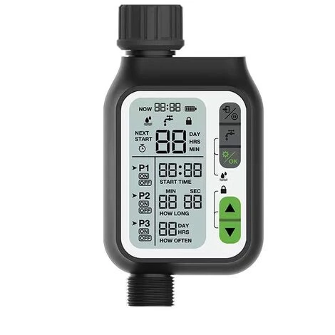 - 3 Separate Bewässerungsprogramme:Durch die Einstellung von 3 unabhängigen Bewässerungsprogrammen können Sie Ihren Bewässerungsplan speichern. Jedes Bewässerungsprogramm kann unterschiedliche Bewässerungshäufigkeiten und Bewässerungszeiten einstellen,so können Sie die Bewässerungszeiten flexibel einstellen und Ihren Anforderungen anpassen.