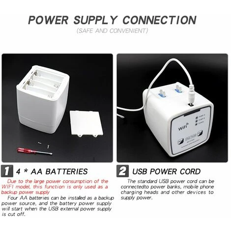 USB-Stromversorgung: 5-V-Gleichstromversorgung , keine Notwendigkeit, die Batterie aufzuladen oder auszutauschen, lange Lebensdauer, bequemer zu bedienen. (AA-Batterie kann als Notstrom verwendet werden.)