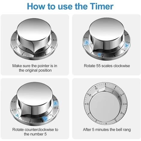 Einfache Bedienung, einfach zu bedienen: Stellen Sie bei der Verwendung des Timers sicher, dass sich die Zeiger in der 0-Position befinden. Bevor Sie die Uhrzeit einstellen, müssen Sie die Uhrzeiger einmal im Uhrzeigersinn drehen, Beginnen Sie dann mit der Einstellung der Zeit gegen den Uhrzeigersinn. Dieser Zeiger hat 60 Minuten, Sie können ihn jederzeit anpassen, drehen Sie einfach den Zeiger, Erwachsene und Kinder können ihn bedienen.