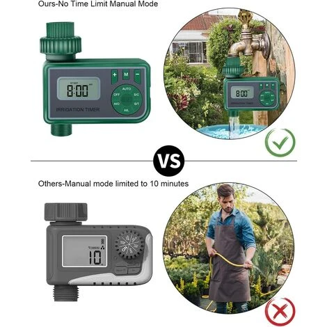 Kein Zeitlimit Manueller Modus: Es gibt kein Zeitlimit für den manuellen Modus, ermöglicht Ihnen einfachen Zugriff auf den Wasserhahn, wann immer Sie das Wasser laufen lassen müssen, ohne Ihre geplante Bewässerung zu unterbrechen. Bewässerungsprogramm.