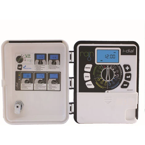 Der Programmierer Regen I-DIAL ist eine neue elektronische Programmierer 6 Außenstationen für Anwendungen im WohnbereichFür Bewässerungssysteme auf Basis von 24-V-ElektroventilenFolgt der Philosophie der Regen Programmierer leicht Programm in 3 Schritten: Startzeit, Dauer und Häufigkeit der Bewässerung.EigenschaftenDas Modell hat 24 VAC bis 230 VAC Leistungs 50Hz. Es hat auch zwei Batterien, wenn der Strom ausfällt (nicht enthalten)Vier unabhängige Bewässerungsprogramme4 Stunden von Beginn der unabhängigen Bewässerung (eine pro-Programm)Bewässerungszeit: 1 min bis 240 min pro StationBildschirmanzeige der nächsten Bewässerungalle 19 Tage von 4 bis Tag bis 1: GiesszyklenBewässerungsplan 7 Tage mit individueller Auswahl des Tages oder der Bewässerung Intervall von 1 bis 19 TageProzentual Kontrolle Bewässerung von 10% bis 200%24V-Modell kann ein Hauptventil / PumpenschwengelRegen SensoreingangVon hinten beleuchtete LCD-AnzeigeBatteriewechselanzeige und BatteriewechselFestspeicher. Speichern Sie die Programmierung auch ohne Batterien6 Zone BewässerungFür die Platzierung außerhalb24V Magnetbetätigte
