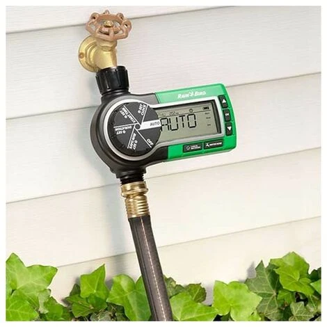 Digitaler Garten-Timer, der eine Bewässerungszone steuert. Es wird mit dem 3/4 „Gewinde Ihres Gartenhahns verbunden.