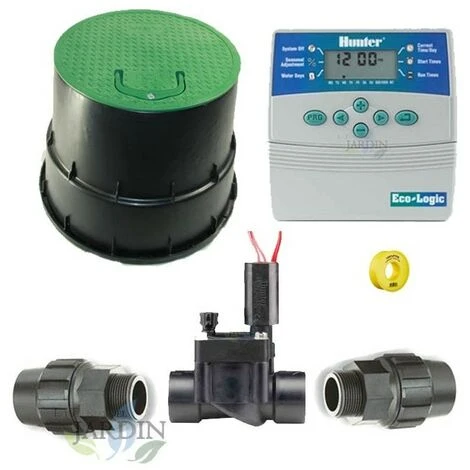 - Automatisches Bewässerungsset für die Bewässerung, das folgendes Material enthält: Hunter Eco Logic 4 Indoor-Zonenprogrammierer, 2 Magnetventile PGV100 1″ 24 V, Teflon 12 Meter 12 mm, 3 Außengewindeanschlüsse 32 mm PE, Verteiler für 2 Bewässerungszonen, Stahlschlüssel zum Festziehen und mittlere Brust 42x33x20 cm.