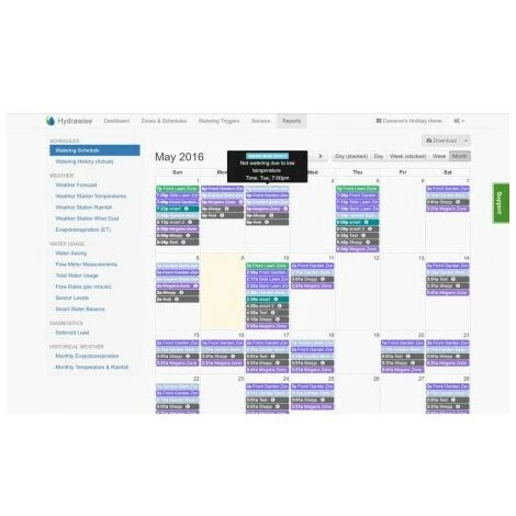 Hunter Bewässerungs Scheduler Wifi HC Hydrawise 12 Outer Zones Die Bewässerung Controller ist ein Hydrawise Cloud-basierte Lösung Internet, das Wasser in einem Bewässerungssystem erforderlich steuern. Der Anwender kann die Vorteile der vorgeschlagenen prädiktiven Software-Einstellung nimmt Einsparungen in der erforderlichen Menge an Wasser in einem Garten zu erreichen. Hydrawise ist auch ein leistungsfähiges Werkzeug für den professionellen Auftragnehmer kann seinen Kunden integrierte Verwaltung ihrer Bewässerungssysteme mit der Möglichkeit bieten zu Störungen in Rohrleitungen und Ventile umgehend reagieren. Es ist eine komplette Lösung, die Vorteile für alle. bietet Plattformen: iPhone, Android, Web Optionen Auftragnehmer-Management-System, das den Zugriff auf mehrere Controller ermöglicht. Einstellung prädiktiven Bewässerung basiert auf Wetterdaten aus dem Internet, die 50% Erzeugungs Einsparungen beim Wasserverbrauch erreichen. Berichterstellung Funktionen für einen genaueren Blick von dem, was mit dem System passiert. Internetverbindung überwacht, Durchfluss und Strom durch elektrische Ventile verbraucht. Automatische Generierung von Benachrichtigungen per SMS und in der Anwendung beschädigte Rohre oder Sprinkleranlagen erkennen. Anschluss 24V Elektromagnet. Außenwand Platzierung. (Kein Wasser fallen Sie nur drinnen in interperie colorcarlo) -Management-System für den professionellen Gärtner Das stellt Hydrawise Software die fortschrittlichste Lösung für die Bewässerung und Kundenmanagement zu verwalten. Hydrawise Portal für Auftragnehmer ist ein einfach zu bedienen, und gleichzeitig vielseitig genug, um aus der Ferne verschiedenen Kunden-Controller zu verwalten. Berichte und Abfragen Finden Sie heraus, wie viel Wasser Ihr System verwendet wurde, ob bei Tag oder Monat und wie viel haben Sie gespeichert. Das vollständige Reporting-Paket ermöglicht es Ihnen Minimum zu erfüllen, Maximum, Durchschnitt und Gesamtwerte für alle Berichte. Sie können Berichte mit den Kunden teilen Sie sie auf beide zu halten, was ihre Bewässerungssysteme geschieht. Aufzeichnungen-Controller Holen Sie sich eine klare Vorstellung von dem, was durch die Vielzahl von Veranstaltungen an Ihr System geschieht den aufgenommenen Controller: erfolgreiche Ausführung der Bewässerung bedingte Ausfälle Verdrahtung erzeugte Warnungen durch in Programmen Durchflußmesser und Änderungen, unter anderem.